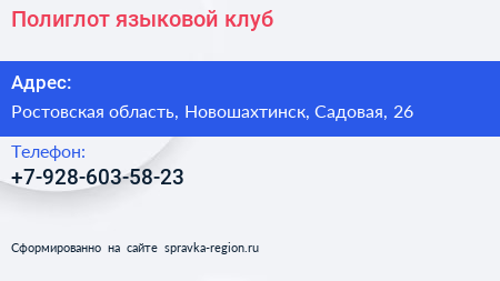 Полиглот, языковой клуб по адресу Ростовская область, Новошахтинск, Садовая, 26 в дальнейшем Организация, размещена в следующих категориях: