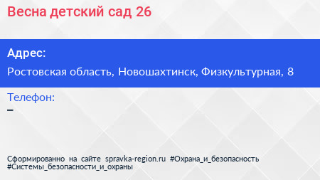 Весна, детский сад №26 по адресу Ростовская область, Новошахтинск, Физкультурная, 8 в дальнейшем Организация, размещена в следующих категориях: