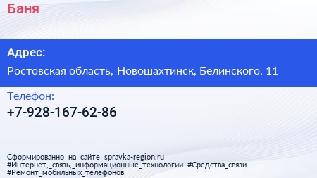 Баня по адресу Ростовская область, Новошахтинск, Белинского, 11 в дальнейшем Организация, размещена в следующих категориях: