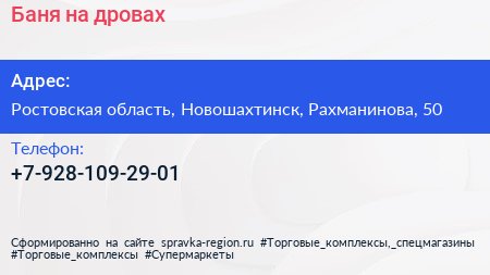 Баня на дровах по адресу Ростовская область, Новошахтинск, Рахманинова, 50 в дальнейшем Организация, размещена в следующих категориях: