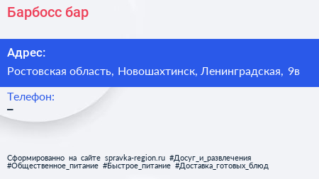 Барбосс, бар по адресу Ростовская область, Новошахтинск, Ленинградская, 9в в дальнейшем Организация, размещена в следующих категориях: