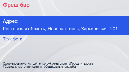 Фреш-бар по адресу Ростовская область, Новошахтинск, Харьковская, 201 в дальнейшем Организация, размещена в следующих категориях: