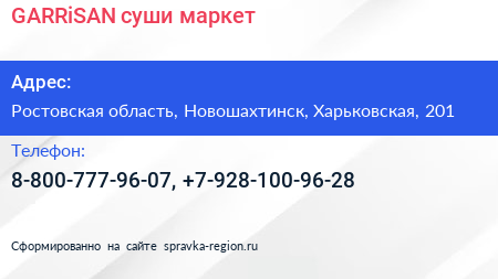 GARRiSAN, суши-маркет по адресу Ростовская область, Новошахтинск, Харьковская, 201 в дальнейшем Организация, размещена в следующих категориях: