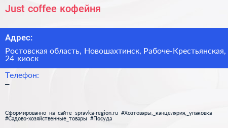 Just coffee, кофейня по адресу Ростовская область, Новошахтинск, Рабоче-Крестьянская, 24 киоск в дальнейшем Организация, размещена в следующих категориях: