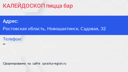КАЛЕЙДОСКОП, пицца-бар по адресу Ростовская область, Новошахтинск, Садовая, 32 в дальнейшем Организация, размещена в следующих категориях: