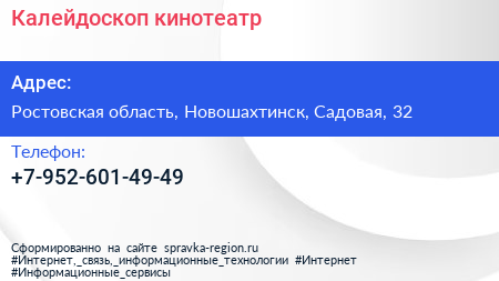 Калейдоскоп, кинотеатр по адресу Ростовская область, Новошахтинск, Садовая, 32 в дальнейшем Организация, размещена в следующих категориях: