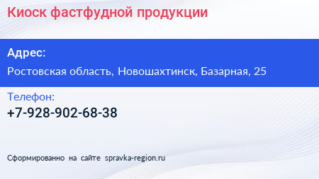 Киоск фастфудной продукции по адресу Ростовская область, Новошахтинск, Базарная, 25 в дальнейшем Организация, размещена в следующих категориях: