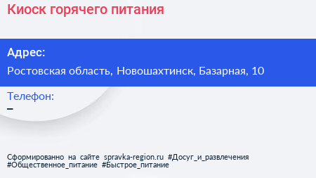 Киоск горячего питания по адресу Ростовская область, Новошахтинск, Базарная, 10 в дальнейшем Организация, размещена в следующих категориях: