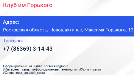Клуб им. Горького по адресу Ростовская область, Новошахтинск, Максима Горького, 13 в дальнейшем Организация, размещена в следующих категориях: