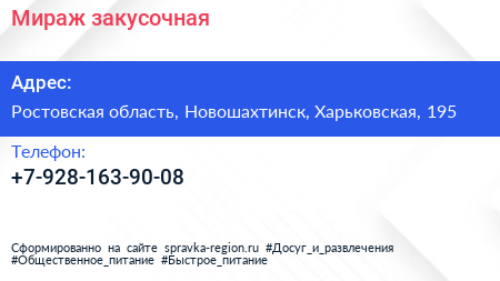 Мираж, закусочная по адресу Ростовская область, Новошахтинск, Харьковская, 195 в дальнейшем Организация, размещена в следующих категориях: