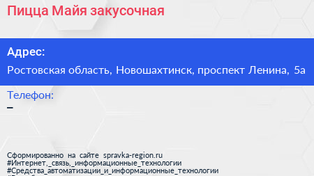 Пицца Майя, закусочная по адресу Ростовская область, Новошахтинск, проспект Ленина, 5а в дальнейшем Организация, размещена в следующих категориях:
