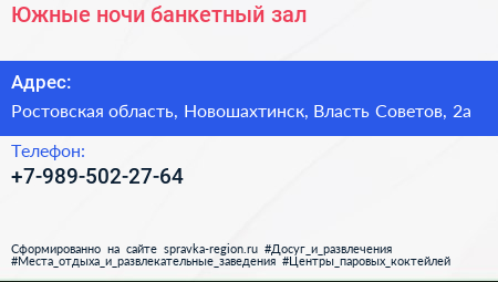 Южные ночи, банкетный зал по адресу Ростовская область, Новошахтинск, Власть Советов, 2а в дальнейшем Организация, размещена в следующих категориях: