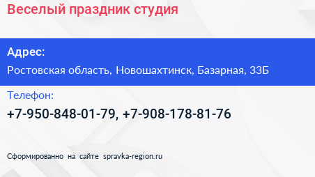 Веселый праздник, студия по адресу Ростовская область, Новошахтинск, Базарная, 33Б в дальнейшем Организация, размещена в следующих категориях: