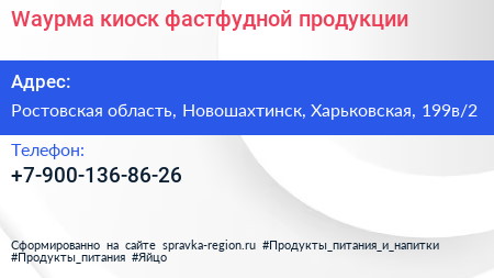 Wаурма, киоск фастфудной продукции по адресу Ростовская область, Новошахтинск, Харьковская, 199в/2 в дальнейшем Организация, размещена в следующих категориях: