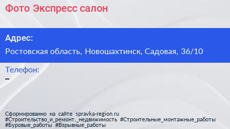 Фото-Экспресс, салон по адресу Ростовская область, Новошахтинск, Садовая, 36/10 в дальнейшем Организация, размещена в следующих категориях: