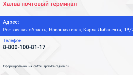 Халва, почтовый терминал по адресу Ростовская область, Новошахтинск, Карла Либкнехта, 19/2 в дальнейшем Организация, размещена в следующих категориях: