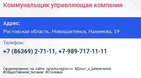Коммунальщик, управляющая компания по адресу Ростовская область, Новошахтинск, Нахимова, 19 в дальнейшем Организация, размещена в следующих категориях:
