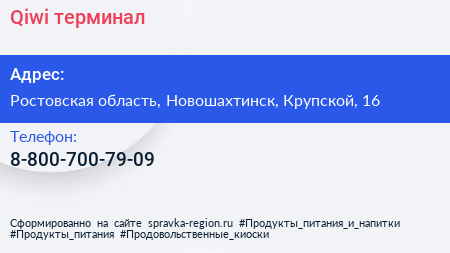Qiwi, терминал по адресу Ростовская область, Новошахтинск, Крупской, 16 в дальнейшем Организация, размещена в следующих категориях: