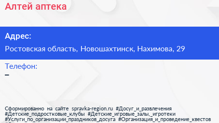 Алтей, аптека по адресу Ростовская область, Новошахтинск, Нахимова, 29 в дальнейшем Организация, размещена в следующих категориях: