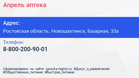 Апрель, аптека по адресу Ростовская область, Новошахтинск, Базарная, 33а в дальнейшем Организация, размещена в следующих категориях: