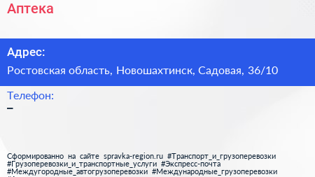 Аптека по адресу Ростовская область, Новошахтинск, Садовая, 36/10 в дальнейшем Организация, размещена в следующих категориях: