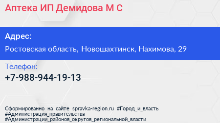 Аптека, ИП Демидова М.С. по адресу Ростовская область, Новошахтинск, Нахимова, 29 в дальнейшем Организация, размещена в следующих категориях: