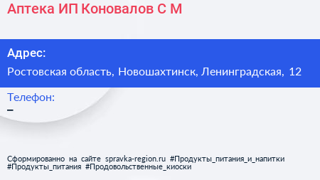 Аптека, ИП Коновалов С.М. по адресу Ростовская область, Новошахтинск, Ленинградская, 12 в дальнейшем Организация, размещена в следующих категориях: