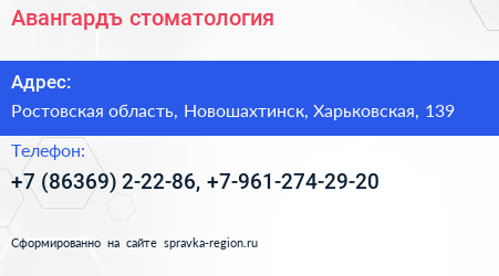 Авангардъ, стоматология по адресу Ростовская область, Новошахтинск, Харьковская, 139 в дальнейшем Организация, размещена в следующих категориях: