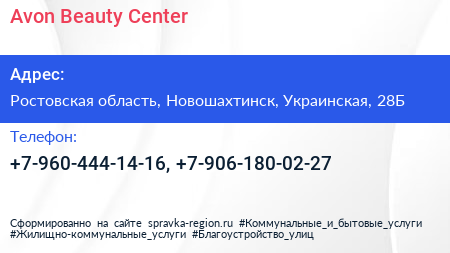 Avon Beauty Center по адресу Ростовская область, Новошахтинск, Украинская, 28Б в дальнейшем Организация, размещена в следующих категориях: