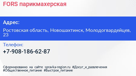 FORS, парикмахерская по адресу Ростовская область, Новошахтинск, Молодогвардейцев, 23 в дальнейшем Организация, размещена в следующих категориях: