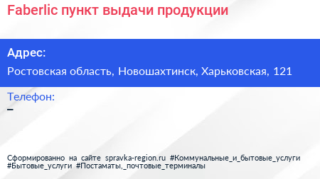Faberlic, пункт выдачи продукции по адресу Ростовская область, Новошахтинск, Харьковская, 121 в дальнейшем Организация, размещена в следующих категориях: