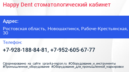 Happy-Dent, стоматологический кабинет по адресу Ростовская область, Новошахтинск, Рабоче-Крестьянская, 30 в дальнейшем Организация, размещена в следующих категориях: