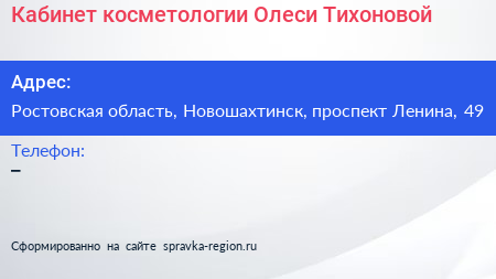 Кабинет косметологии Олеси Тихоновой по адресу Ростовская область, Новошахтинск, проспект Ленина, 49 в дальнейшем Организация, размещена в следующих категориях: