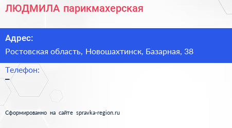 ЛЮДМИЛА, парикмахерская по адресу Ростовская область, Новошахтинск, Базарная, 38 в дальнейшем Организация, размещена в следующих категориях: