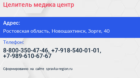 Целитель, медика-центр по адресу Ростовская область, Новошахтинск, Зорге, 40 в дальнейшем Организация, размещена в следующих категориях: