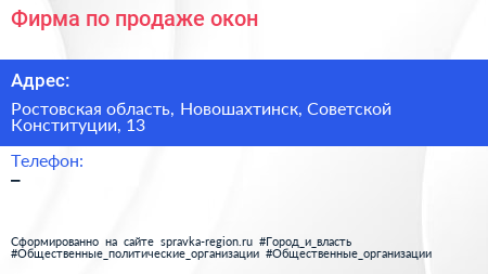 Фирма по продаже окон по адресу Ростовская область, Новошахтинск, Советской Конституции, 13 в дальнейшем Организация, размещена в следующих категориях: