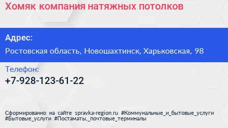 Хомяк, компания натяжных потолков по адресу Ростовская область, Новошахтинск, Харьковская, 98 в дальнейшем Организация, размещена в следующих категориях: