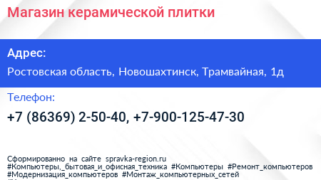 Магазин керамической плитки по адресу Ростовская область, Новошахтинск, Трамвайная, 1д в дальнейшем Организация, размещена в следующих категориях: