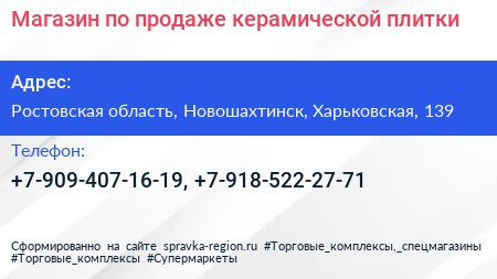 Магазин по продаже керамической плитки по адресу Ростовская область, Новошахтинск, Харьковская, 139 в дальнейшем Организация, размещена в следующих категориях: