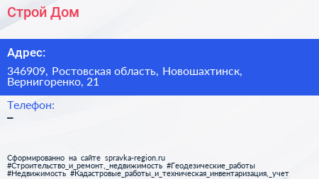 Строй Дом по адресу 346909, Ростовская область, Новошахтинск, Вернигоренко, 21 в дальнейшем Организация, размещена в следующих категориях: