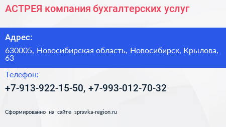 АСТРЕЯ, компания бухгалтерских услуг по адресу 630005, Новосибирская область, Новосибирск, Крылова, 63 в дальнейшем Организация, размещена в следующих категориях: