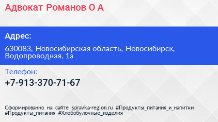 Адвокат Романов О.А. по адресу 630083, Новосибирская область, Новосибирск, Водопроводная, 1а в дальнейшем Организация, размещена в следующих категориях:
