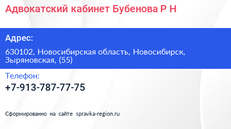 Адвокатский кабинет Бубенова Р.Н. по адресу 630102, Новосибирская область, Новосибирск, Зыряновская, (55) в дальнейшем Организация, размещена в следующих категориях:
