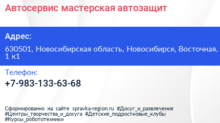 Автосервис-мастерская автозащит по адресу 630501, Новосибирская область, Новосибирск, Восточная, 1 к1 в дальнейшем Организация, размещена в следующих категориях: