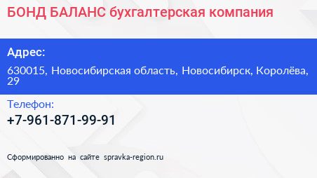 БОНД БАЛАНС, бухгалтерская компания по адресу 630015, Новосибирская область, Новосибирск, Королёва, 29 в дальнейшем Организация, размещена в следующих категориях: