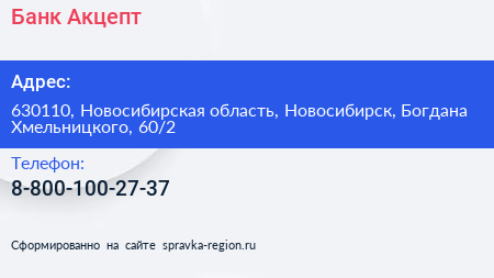 Банк Акцепт по адресу 630110, Новосибирская область, Новосибирск, Богдана Хмельницкого, 60/2 в дальнейшем Организация, размещена в следующих категориях: