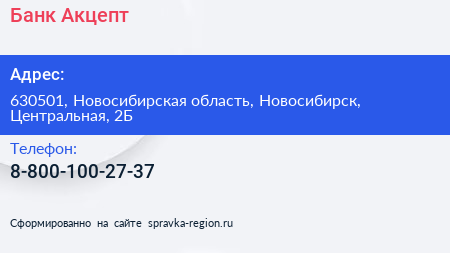 Банк Акцепт по адресу 630501, Новосибирская область, Новосибирск, Центральная, 2Б в дальнейшем Организация, размещена в следующих категориях: