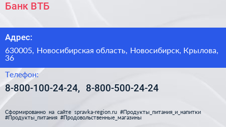 Банк ВТБ по адресу 630005, Новосибирская область, Новосибирск, Крылова, 36 в дальнейшем Организация, размещена в следующих категориях:
