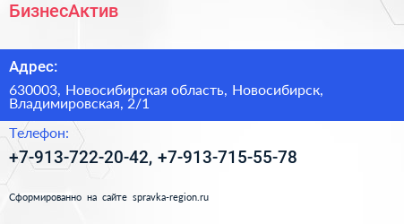 БизнесАктив по адресу 630003, Новосибирская область, Новосибирск, Владимировская, 2/1 в дальнейшем Организация, размещена в следующих категориях: