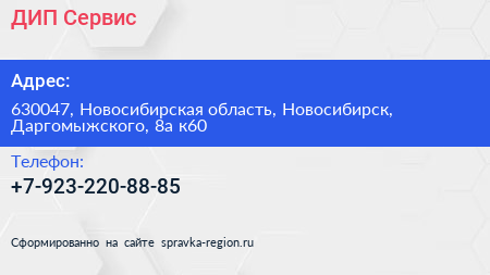 ДИП-Сервис по адресу 630047, Новосибирская область, Новосибирск, Даргомыжского, 8а к60 в дальнейшем Организация, размещена в следующих категориях: